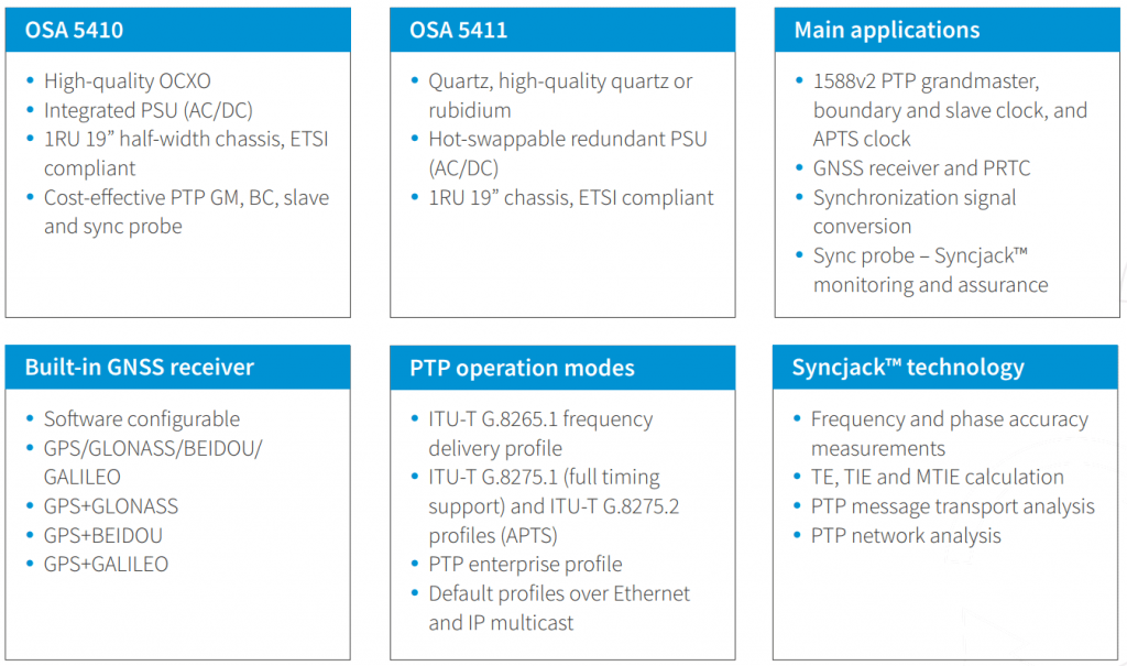 Our OSA 5410 family of IEEE 1588v2 Precision Time Protocol (PTP) access grandmaster devices is optimized for synchronisation distribution, testing and assurance at the network edge.